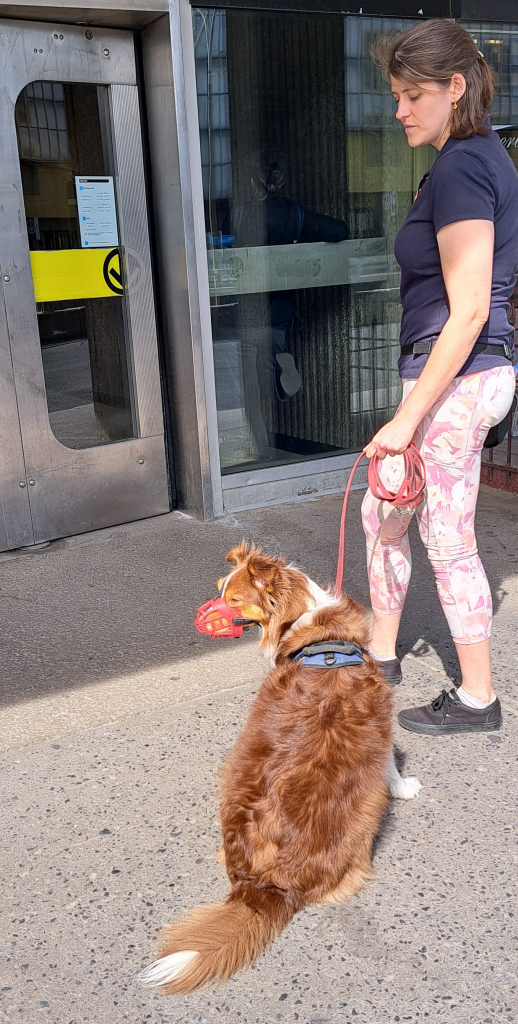There are MANY other reasons dogs wear muzzles: they eat poop (remember, dogs are coprophagous, yum!) , they pick up anything and everything outside with their mouth and will swallow it, they’re scared of other dogs, in order to go into the Montreal metro, they’re scared at the vet, they’re scared at the groomer.